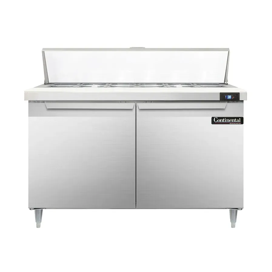 Streamline your restaurant cooking operations with the Continental Refrigerator D48N12 Refrigerated Counter, Sandwich / Salad Unit. This designer line sandwich unit is perfect for commercial restaurant use, offering a spacious 48"W two-section design. It comes with twelve 1/6 size x 4" deep pans and a convenient 12" cutting board, allowing you to easily prepare and assemble sandwiches and salads. The unit features two field rehingeable doors and a stainless steel top, front, sides, and interior, ensuring durability and easy cleaning. With an electronic control and digital display, you can easily monitor and adjust the temperature to keep your ingredients fresh. The hi-low alarm alerts you if the temperature goes outside the desired range. The rear-mounted self-contained refrigeration system with a 1/5 hp compressor ensures efficient cooling. Made in the USA and certified by cETLus and NSF, this sandwich/salad unit is a reliable and high-quality addition to any commercial kitchen.
