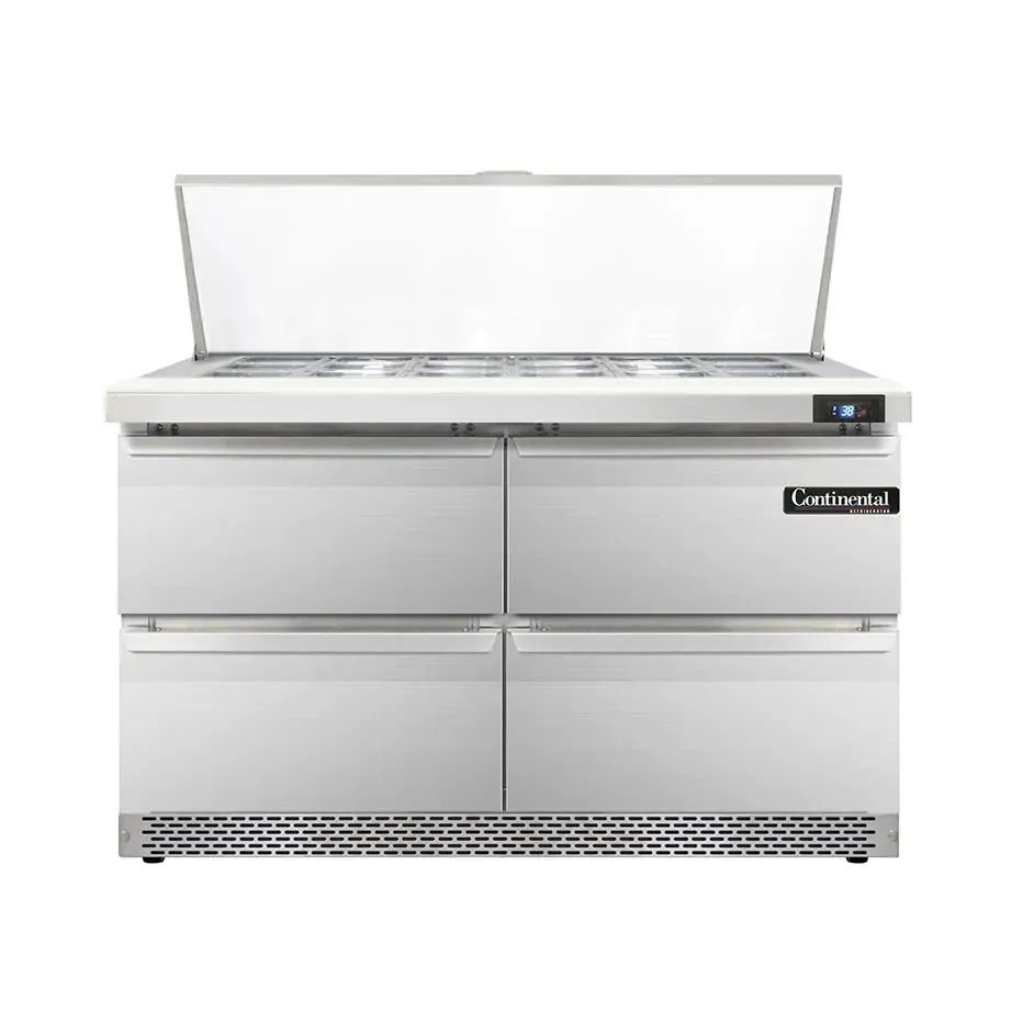 Take your kitchen to the next level with the Continental Refrigerator D48N18M-FB-D Refrigerated Counter, Mega Top Sandwich/Salad Unit. This designer line mighty top sandwich unit is perfect for commercial restaurant use. With its front breather and stainless steel construction, it offers durability and easy maintenance. The unit features a spacious 48" width, two sections, and 18 1/6 size x 4" deep pans with a convenient 10" cutting board. It also includes four drawers that can accommodate various pan sizes, providing flexibility in food storage. The electronic control with a digital display and hi-low alarm ensures precise temperature management and food safety. The rear-mounted self-contained refrigeration system with a 1/5 hp compressor guarantees efficient cooling. Equipped with 3-3/4" casters, this unit is easy to move and clean. Upgrade your kitchen with the Continental Refrigerator D48N18M-FB-D and experience enhanced productivity and organization in your commercial restaurant.