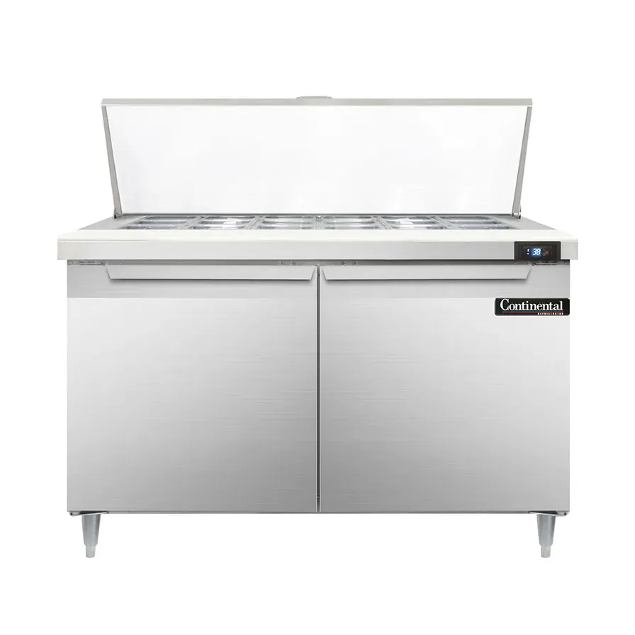 Elevate your dining experience with the Continental Refrigerator D48N18M Refrigerated Counter, Mega Top Sandwich / Salad Unit. This designer line mighty top sandwich unit is perfect for commercial restaurant use. With its spacious 48" width and two-section design, it offers ample storage and organization for your ingredients. The unit comes with 18 1/6 size x 4" deep pans and a convenient 10" cutting board, allowing you to easily assemble sandwiches or salads. The stainless steel construction of the top, front, sides, and interior ensures durability and easy cleaning. The electronic control with a digital display and hi-low alarm provides precise temperature management and alerts you if there are any fluctuations. The rear-mounted self-contained refrigeration system with a 1/5 hp compressor ensures efficient cooling. With adjustable legs and field rehingeable doors, this unit offers flexibility and convenience. Upgrade your restaurant's food preparation area with the Continental Refrigerator D48N18M Refrigerated Counter, Mega Top Sandwich / Salad Unit.
