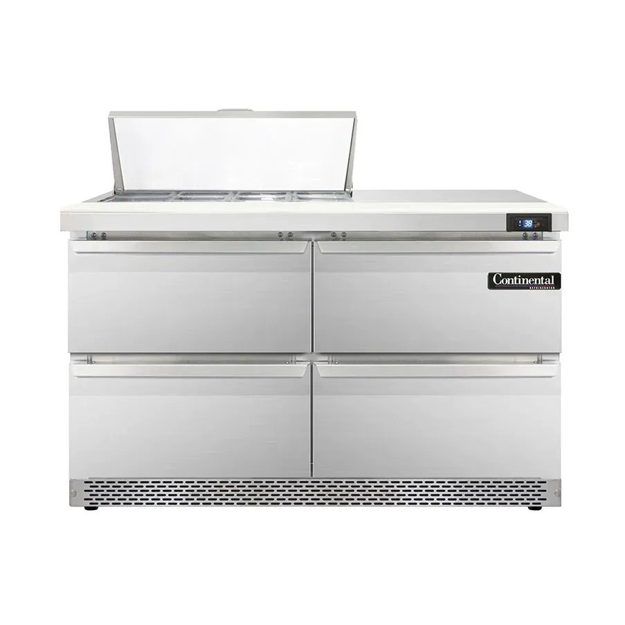 Upgrade your restaurant kitchen with the Continental Refrigerator D48N8-FB-D Refrigerated Counter, Sandwich / Salad Unit. This designer line sandwich unit is perfect for commercial restaurant use, offering a sleek and functional addition to your kitchen. With a front breather and stainless steel construction on the top, front, sides, and interior, this unit is built to withstand the demands of a busy kitchen. The unit features two sections, with eight 1/6 size x 4" deep pans and a 12" cutting board for easy food preparation. Additionally, it includes four drawers that can accommodate various pan sizes, providing flexibility in your food storage options. The electronic control with a digital display and hi-low alarm ensures precise temperature control and monitoring. With rear-mounted self-contained refrigeration and 3-3/4" casters, this unit is easy to move and position in your kitchen. Trust Continental Refrigerator for quality and reliability, as this unit is made in the USA and certified by cETLus and NSF. Upgrade your kitchen today with the Continental Refrigerator D48N8-FB-D Refrigerated Counter, Sandwich / Salad Unit.