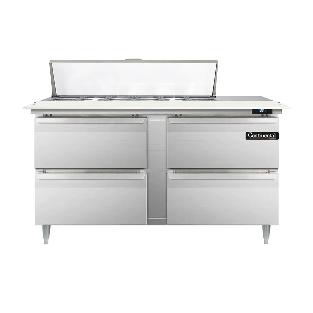 Equip your commercial kitchen with the Continental Refrigerator D60N12C-D Refrigerated Counter, Sandwich / Salad Unit. This designer line sandwich unit is perfect for restaurants looking to optimize their food preparation process. With a spacious 60" width and two sections, it provides ample storage and organization for your ingredients. The unit comes with twelve 1/6 size pans, each 4" deep, and a convenient 19" cutting board for easy meal assembly. Additionally, it features four drawers that can accommodate a 12 x 20 x 6 pan each (supplied by others). The stainless steel construction ensures durability and easy cleaning, while the electronic control with a digital display allows for precise temperature management. The hi-low alarm alerts you to any temperature fluctuations, ensuring food safety. With rear-mounted self-contained refrigeration and 6" adjustable legs, this unit is both efficient and versatile. Trust Continental Refrigerator, a reputable brand known for its quality and reliability. Upgrade your kitchen with this refrigerated counter and enhance your restaurant's efficiency and productivity.