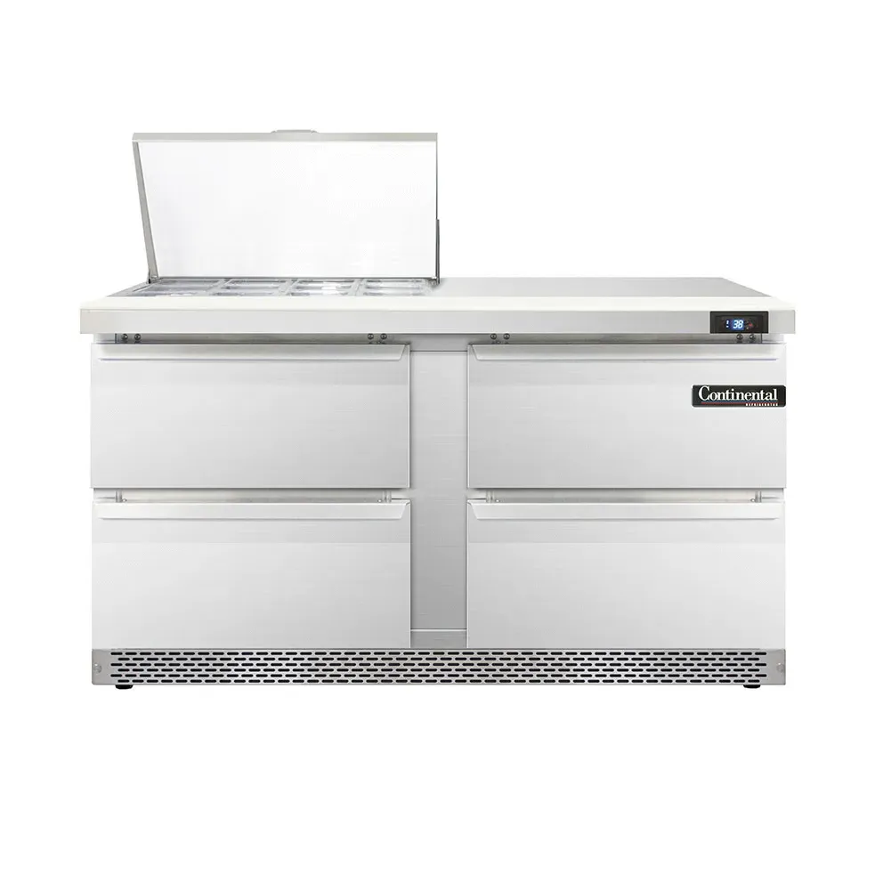 Revolutionize your cooking setup with the Continental Refrigerator D60N12M-FB-D Refrigerated Counter, Mega Top Sandwich / Salad Unit. This designer line mighty top sandwich unit is perfect for commercial restaurant use. With its front breather and stainless steel construction on the top, front, sides, and interior, this unit is built to withstand the demands of a busy kitchen. The unit features a spacious 60" width, two sections, and 12 1/6 size pans with a 10" cutting board, providing ample space for preparing sandwiches and salads. The four drawers can accommodate a 12 x 20 x 6 pan each, allowing for easy organization and access to ingredients. The electronic control with a digital display and hi-low alarm ensures precise temperature control and monitoring. With rear-mounted self-contained refrigeration and 3-3/4" casters, this unit is easy to move and position in your kitchen. Upgrade your restaurant's food preparation capabilities with the Continental Refrigerator D60N12M-FB-D Refrigerated Counter, Mega Top Sandwich / Salad Unit.