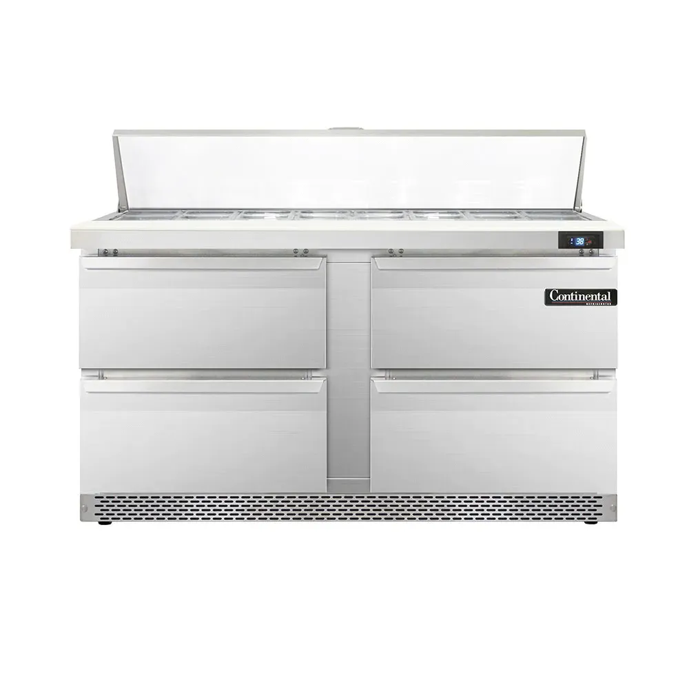 Realize kitchen dreams with the Continental Refrigerator D60N16-FB-D Refrigerated Counter, Sandwich / Salad Unit. This designer line sandwich unit is perfect for commercial restaurant use, offering a spacious 60" width and two sections to accommodate all your food preparation needs. With 16 1/6 size x 4" deep pans and a 12" cutting board, you'll have plenty of space to organize and assemble your sandwiches and salads. The unit also features four drawers, each capable of holding a 12 x 20 x 6 pan (supplied by others), providing convenient storage for your ingredients. Made in the USA, this sandwich unit boasts a stainless steel top, front, sides, and interior, ensuring durability and easy cleaning. The electronic control with a digital display and hi-low alarm allows for precise temperature management, while the rear-mounted self-contained refrigeration system ensures efficient cooling. With its sleek design and reliable performance, the Continental Refrigerator D60N16-FB-D is the ideal addition to any commercial kitchen.