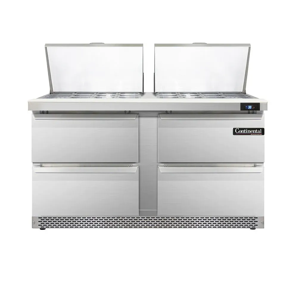 Mobilize your kitchen with the Continental Refrigerator D60N24M-FB-D Refrigerated Counter, Mega Top Sandwich / Salad Unit. This designer line mighty top sandwich unit is perfect for commercial restaurant use. With its front breather and stainless steel construction on the top, front, sides, and interior, this unit is built to withstand the demands of a busy kitchen. The unit features two sections, with 24 1/6 size x 4" deep pans and a 10" cutting board for easy food preparation. It also includes four drawers that can accommodate a 12 x 20 x 6 pan each (supplied by others). The electronic control with a digital display and hi-low alarm ensures precise temperature control and food safety. The rear-mounted self-contained refrigeration system with a 1/4 HP compressor keeps your ingredients fresh and ready to use. With its mobility provided by 3-3/4" casters, this unit can be easily moved around the kitchen as needed. Upgrade your kitchen with the Continental Refrigerator D60N24M-FB-D Refrigerated Counter, Mega Top Sandwich / Salad Unit.