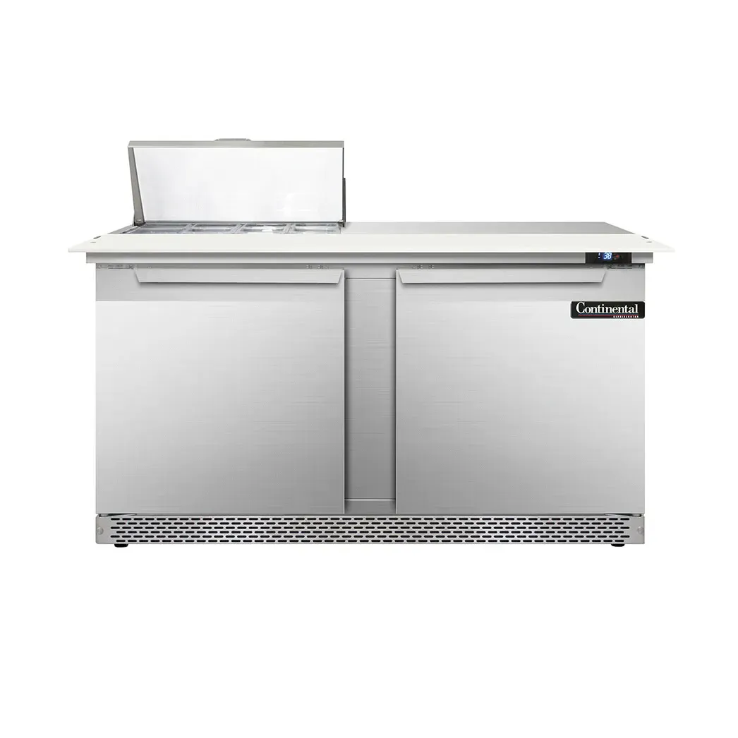 Elevate your dining experience with the Continental Refrigerator D60N8C-FB Refrigerated Counter, Sandwich / Salad Unit. This designer line sandwich unit is perfect for commercial restaurant use, offering a sleek and functional addition to your kitchen. With a spacious 60" width and two sections, this unit provides ample storage and preparation space for your sandwiches and salads. The unit comes with eight 1/6 size pans, each 4" deep, along with a convenient 19" cutting board for easy food preparation. The stainless steel top, front, sides, and interior ensure durability and easy cleaning, while the electronic control with digital display allows for precise temperature management. The hi-low alarm feature ensures that your food stays fresh and safe. With rear-mounted self-contained refrigeration and 3-3/4" casters, this unit is easy to move and position in your kitchen. Trust in the Continental Refrigerator D60N8C-FB to meet all your refrigeration needs in a commercial restaurant setting.