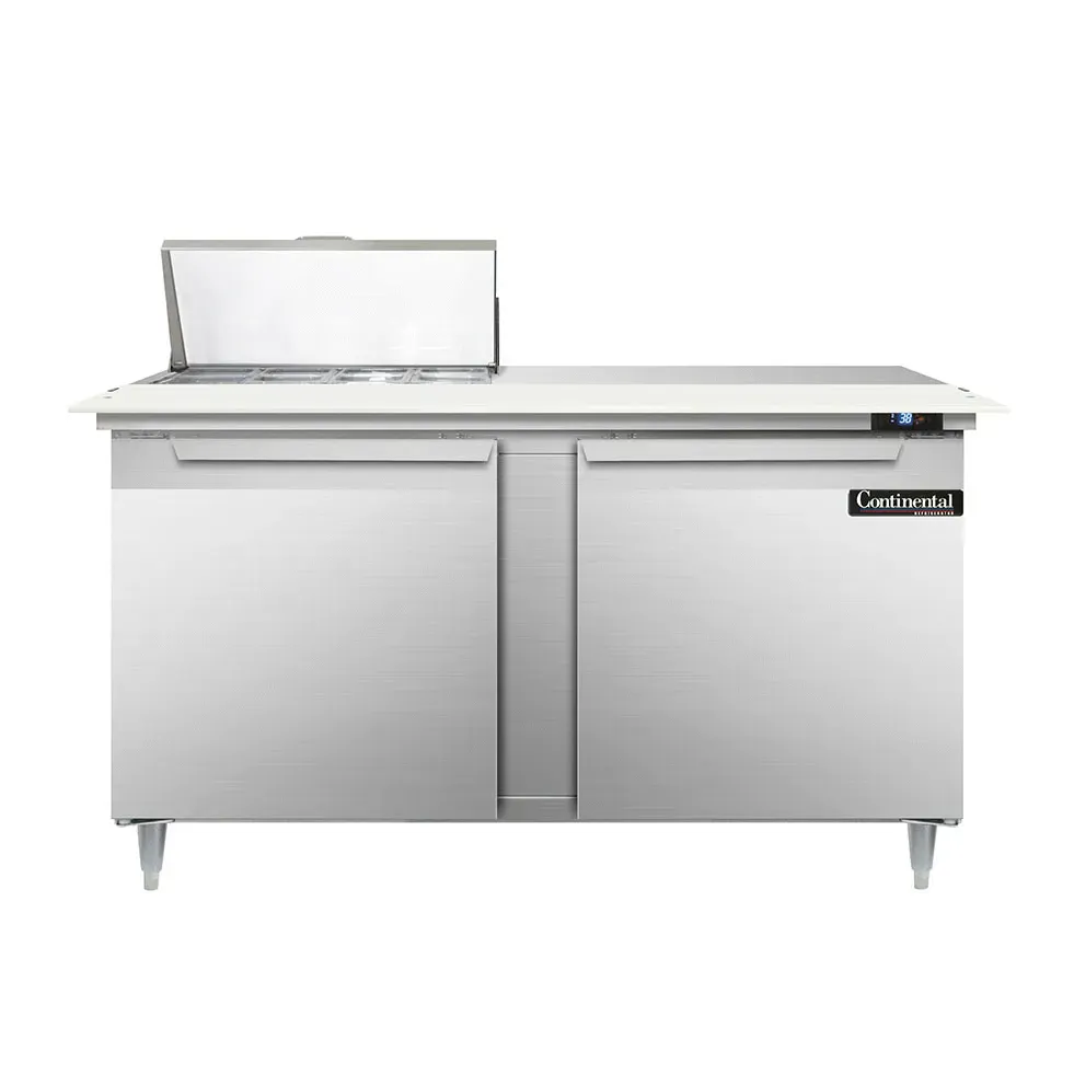 Boost your restaurant's performance with the Continental Refrigerator D60N8C Refrigerated Counter, Sandwich / Salad Unit. This designer line sandwich unit is perfect for commercial restaurant use, offering a spacious 60" width and two sections to accommodate your needs. It comes with eight 1/6 size x 4" deep pans and a convenient 19" cutting board, allowing you to easily prepare and assemble sandwiches and salads. The unit features two field rehingeable doors, ensuring easy access to your ingredients. Made in the USA, this sandwich unit is built to last with its stainless steel top, front, sides, and interior. The electronic control with a digital display and hi-low alarm provides precise temperature management and peace of mind. With rear-mounted self-contained refrigeration and 6" adjustable legs, this unit offers flexibility and convenience. Upgrade your restaurant's kitchen with the Continental Refrigerator D60N8C Refrigerated Counter, Sandwich / Salad Unit and experience enhanced efficiency and productivity.