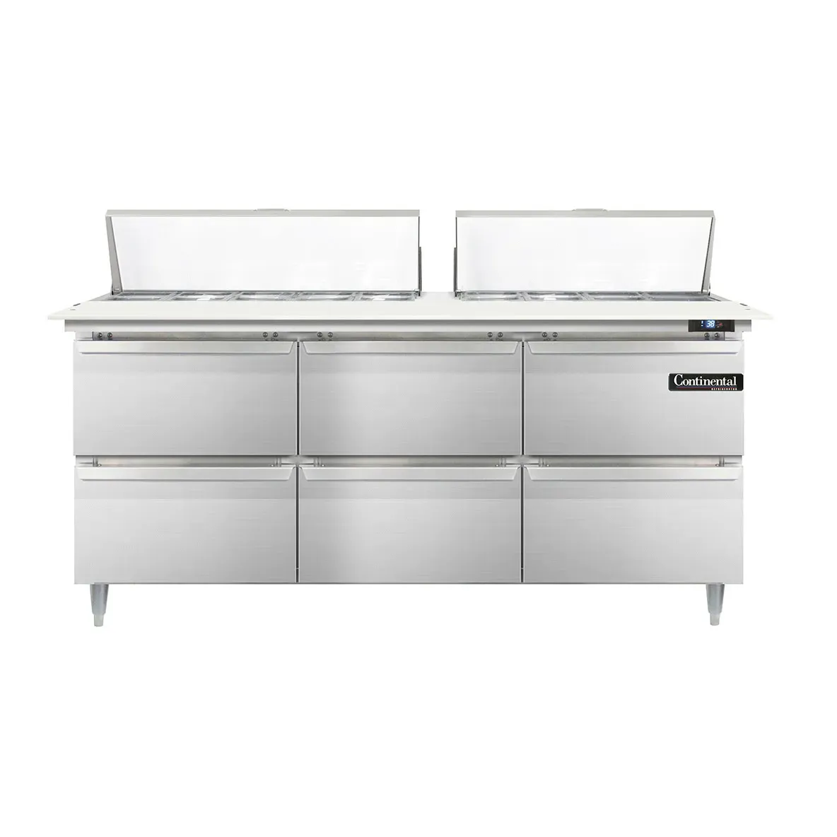 Transform your food service with the Continental Refrigerator D72N18C-D Refrigerated Counter, Sandwich/Salad Unit. This designer line sandwich unit is perfect for commercial restaurants looking to optimize their food preparation and storage capabilities. With its spacious 72" width and three-section design, this unit provides ample space for all your ingredients and supplies. The unit comes with 18 1/6 size pans, each 4" deep, and a convenient 19" cutting board for easy food preparation. Additionally, it features six drawers that can accommodate either a 12 x 18 x 6 pan or a combination of a 1/2 x 6 pan and a 1/3 x 6 pan. The stainless steel construction ensures durability and easy cleaning, while the electronic control with a digital display allows for precise temperature management. With its hi-low alarm and rear-mounted self-contained refrigeration, this unit guarantees optimal food safety. Trust in the Continental Refrigerator D72N18C-D to enhance your restaurant's efficiency and productivity. Made in the USA, this refrigerated counter is cETLus and NSF certified, ensuring its quality and reliability.