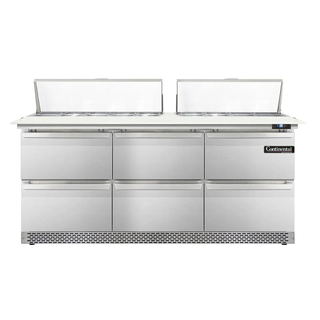 Culinary excellence in every dish starts with the Continental Refrigerator D72N18C-FB-D Refrigerated Counter, Sandwich / Salad Unit. This designer line sandwich unit is a must-have for any commercial restaurant looking to elevate their food preparation and storage capabilities. With its spacious three-section design, this unit offers ample storage space for all your ingredients. The unit comes with 18 1/6 size pans, each 4" deep, and a 19" cutting board, providing convenience and efficiency during food preparation. The six drawers are designed to accommodate a variety of pan sizes, allowing for versatile storage options. Made in the USA with stainless steel construction, this unit is built to withstand the demands of a busy kitchen. The electronic control with a digital display and hi-low alarm ensures precise temperature control and food safety. With rear-mounted self-contained refrigeration and 3-3/4" casters, this unit is easy to move and position in your kitchen. Trust Continental Refrigerator for reliable and high-quality refrigeration solutions that enhance your culinary creations.