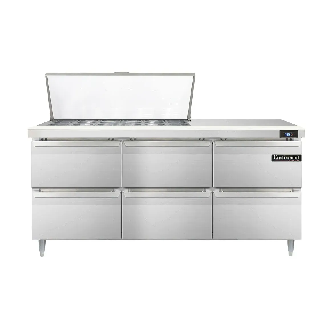 Maximize your food service potential with the Continental Refrigerator D72N18M-D Refrigerated Counter, Mega Top Sandwich / Salad Unit. This designer line mighty top sandwich unit is perfect for commercial restaurants looking to enhance their food preparation and storage capabilities. With its spacious 72" width and three-section design, this unit offers ample space for all your ingredients and supplies. The unit comes with 18 1/6 size pans, each 4" deep, and a convenient 10" cutting board for efficient food preparation. Additionally, it features six drawers that can accommodate either a 12 x 18 x 6 pan or a combination of a 1/2 x 6 pan and a 1/3 x 6 pan, providing versatile storage options. Made with stainless steel construction, this unit is durable and easy to clean. The electronic control with a digital display and hi-low alarm ensures precise temperature management. With rear-mounted self-contained refrigeration and 6" adjustable legs, this unit is both efficient and convenient. Upgrade your restaurant's kitchen with the Continental Refrigerator D72N18M-D Refrigerated Counter, Mega Top Sandwich / Salad Unit and experience enhanced productivity and organization.