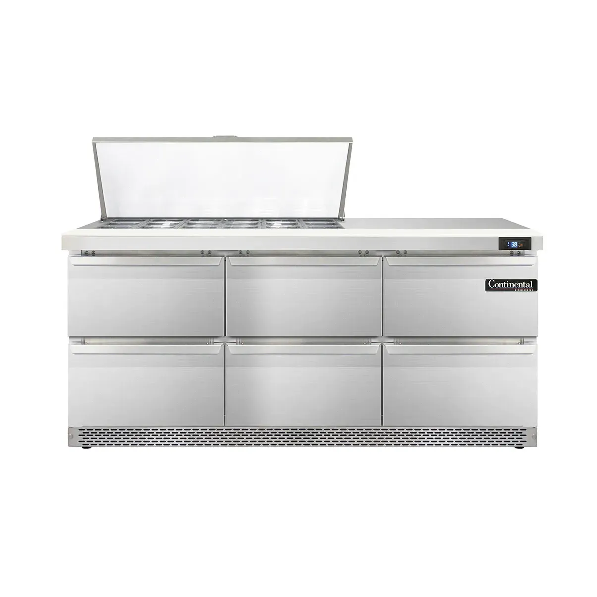 Enhance the heart of your restaurant with the Continental Refrigerator D72N18M-FB-D Refrigerated Counter, Mega Top Sandwich / Salad Unit. This designer line mighty top sandwich unit is perfect for commercial restaurant use. With its spacious 72" width and three-section design, it offers ample storage and preparation space for your sandwiches and salads. The unit comes with 18 1/6 size pans that are 4" deep, along with a convenient 10" cutting board for easy food preparation. The six drawers provide additional storage options, accommodating either a 12 x 18 x 6 pan or a combination of a 1/2 x 6 pan and a 1/3 x 6 pan per drawer. Made with stainless steel construction, this unit is durable and easy to clean. The electronic control with a digital display allows for precise temperature management, while the hi-low alarm ensures food safety. With rear-mounted self-contained refrigeration and 3-3/4" casters, this unit is both efficient and mobile. Upgrade your restaurant's food preparation area with the Continental Refrigerator D72N18M-FB-D Refrigerated Counter, Mega Top Sandwich / Salad Unit.