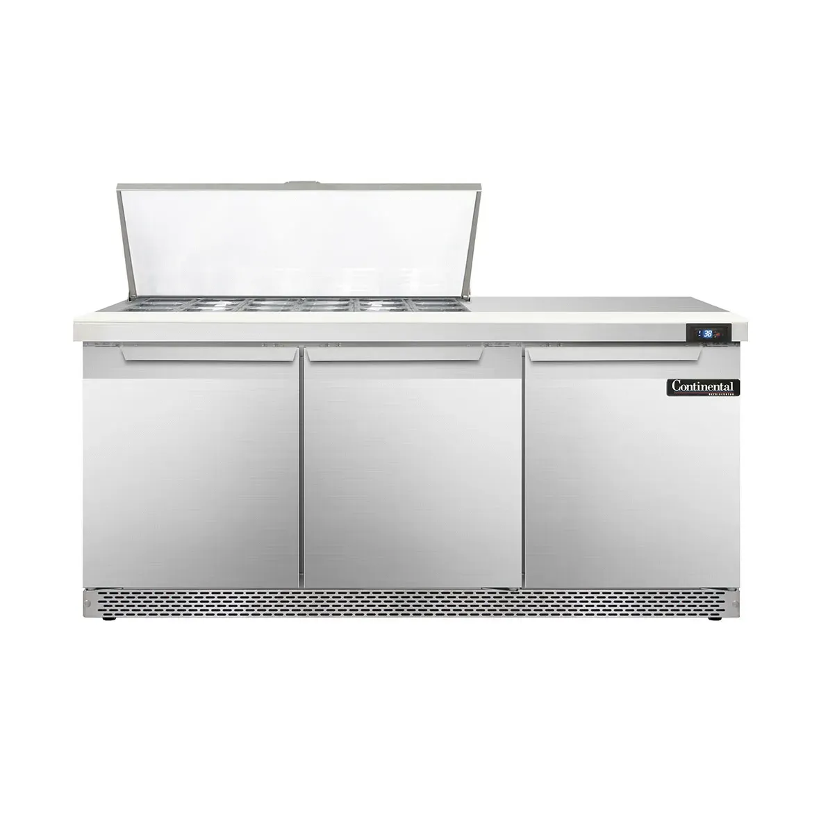 Elevate your dining experience with the Continental Refrigerator D72N18M-FB Refrigerated Counter, Mega Top Sandwich / Salad Unit. This designer line mighty top sandwich unit is perfect for commercial restaurant use. With its three-section design and 72" width, it offers ample space for all your sandwich and salad ingredients. The unit comes with 18 1/6 size pans, each 4" deep, and a convenient 10" cutting board for easy food preparation. The stainless steel top, front, sides, and interior not only provide durability but also give a sleek and professional look to your kitchen. The electronic control with a digital display allows for precise temperature management, while the hi-low alarm ensures food safety. The rear-mounted self-contained refrigeration system with a 1/4 HP compressor keeps your ingredients fresh and cool. With its exceptional features and quality construction, this Continental Refrigerator unit is a must-have for any commercial restaurant looking to enhance its sandwich and salad offerings.