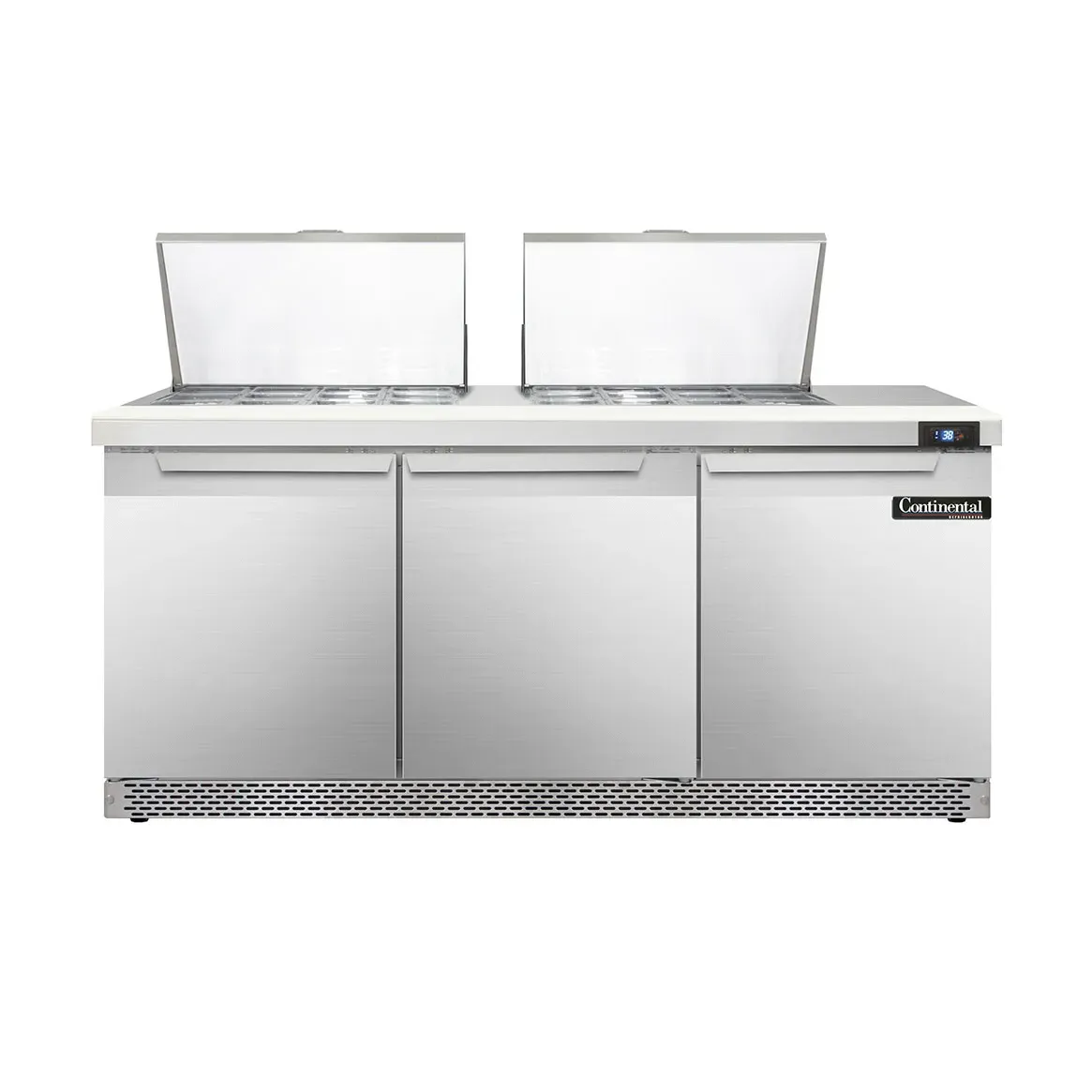 Optimize your kitchen efficiency with the Continental Refrigerator D72N24M-FB Refrigerated Counter, Mega Top Sandwich / Salad Unit. This designer line mighty top sandwich unit is perfect for commercial restaurant use. With its three-section design and 72" width, it offers ample space for all your sandwich and salad ingredients. The unit comes with 24 1/6 size pans that are 4" deep, along with a convenient 10" cutting board for easy food preparation. The stainless steel top, front, sides, and interior not only provide durability but also give the unit a sleek and professional look. The electronic control with a digital display allows for precise temperature management, while the hi-low alarm ensures food safety. The rear-mounted self-contained refrigeration system with a 1/4 HP compressor keeps your ingredients fresh and cool. With its exceptional features and quality construction, this Continental Refrigerator unit is a must-have for any commercial kitchen.