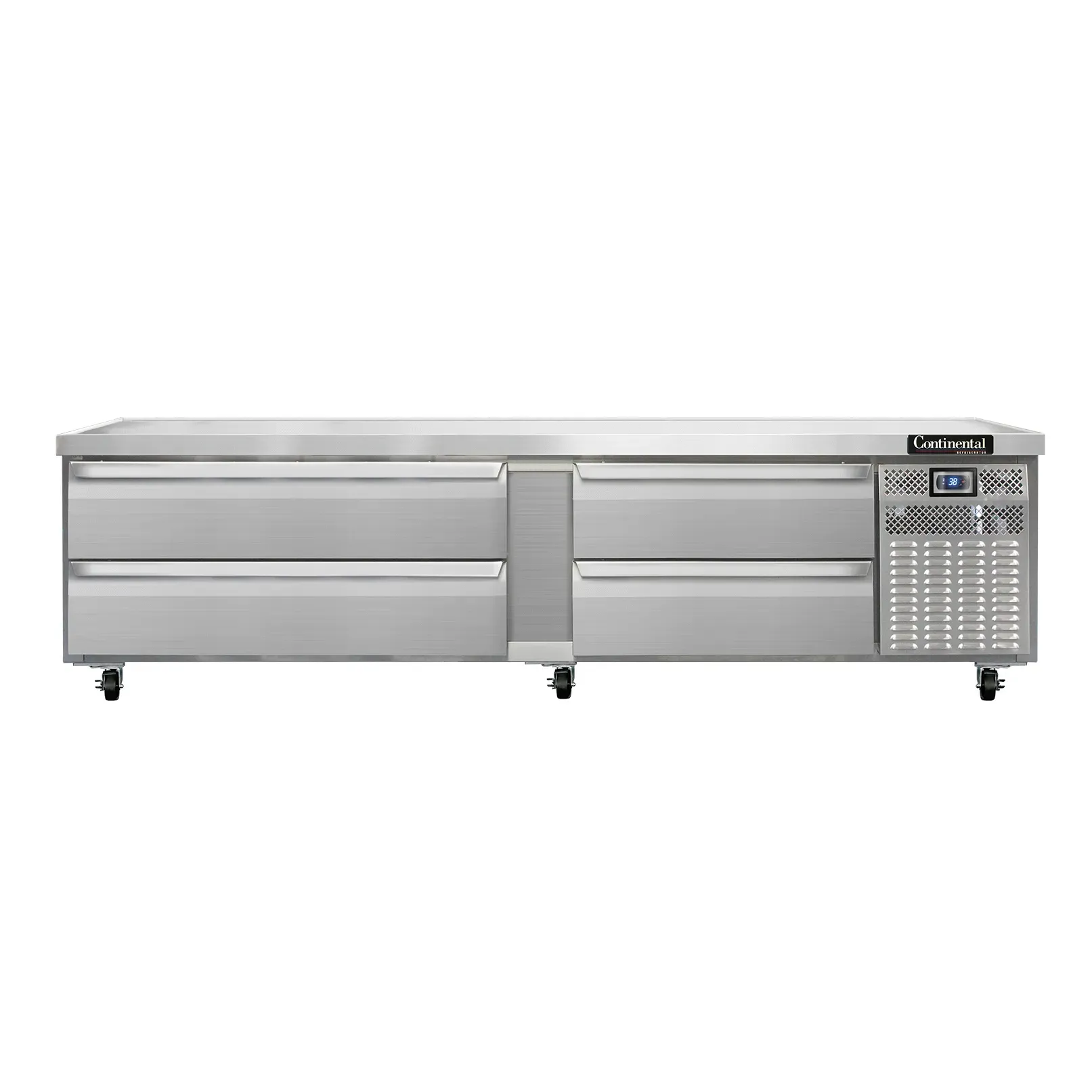 Unleash culinary creativity with the Continental Refrigerator D96GN Equipment Stand. This refrigerated base is a must-have for any commercial restaurant looking to optimize their kitchen space. With its two-section design and four drawers, this stand offers ample storage for all your ingredients and supplies. The stainless steel top with a drip guard marine edge ensures easy cleaning and prevents spills from reaching the floor. The electronic control with a digital display allows for precise temperature management, while the hi-low alarm and high/low temperature alarm ensure food safety. Made in the USA, this stand features self-contained refrigeration and a 1/3 HP compressor for efficient cooling. With its sleek stainless steel exterior and interior, this stand not only provides functionality but also adds a touch of elegance to your kitchen. Trust Continental Refrigerator for reliable and high-quality equipment that will enhance your restaurant's efficiency and productivity.