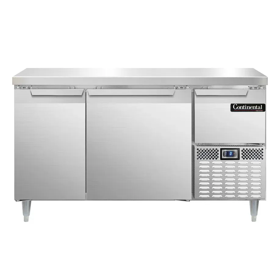 Master your restaurant's kitchen with the Continental Refrigerator DFA60NSS Freezer Counter Work Top. This designer line freezer base worktop unit is a must-have for any commercial restaurant. With a reinforced stainless steel worktop and a stainless steel exterior, front, sides, and interior, this unit is built to withstand the demands of a busy kitchen. The unit features two full-height and one half-height field rehingeable doors, providing easy access to your frozen ingredients. The electronic control with a digital display allows for precise temperature management, while the hi-low alarm ensures that your food stays at the optimal temperature. The side-mounted refrigeration system maximizes storage space, and the 6" adjustable stainless steel legs provide stability. Made in the USA and certified by cETLus and NSF, this freezer counter worktop unit is a reliable and efficient addition to your restaurant's kitchen.