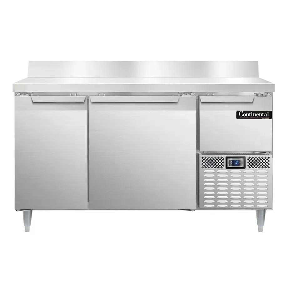 Kitchen innovation at its best, the Continental Refrigerator DFA60NSSBS Freezer Counter is a must-have for any commercial restaurant. This Designer Line Work Top Unit is designed to provide maximum functionality and durability. With a reinforced stainless steel worktop and a 5-1/2"H backsplash, it offers a spacious and hygienic surface for food preparation. The stainless steel exterior, front, sides, and interior ensure easy cleaning and long-lasting performance. The unit features two full-height and one half-height field rehingeable doors, allowing for convenient access to the contents. The electronic control with a digital display and hi-low alarm ensures precise temperature management and food safety. The side-mounted refrigeration system maximizes storage space and efficiency. With 6" adjustable stainless steel legs, this freezer counter can be easily customized to fit any kitchen layout. Made in the USA and certified by cETLus and NSF, this Continental Refrigerator DFA60NSSBS is a reliable and high-quality addition to any commercial kitchen.