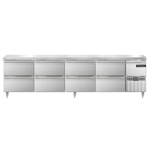 Elevate your culinary experience with the Continental Refrigerator DRA118NSS-D Refrigerated Counter Work Top. This designer line unit is perfect for commercial restaurant use, offering a spacious 118"W reinforced stainless steel worktop for all your food preparation needs. The stainless steel exterior, front, sides, and interior not only provide a sleek and professional look but also ensure durability and easy cleaning. With eight drawers and one half-height field rehingeable door, you'll have ample storage space for your ingredients and supplies. The electronic control with a digital display allows for precise temperature management, while the hi-low alarm ensures food safety. The side-mounted refrigeration system maximizes storage space and efficiency. Made in the USA and certified by cETLus and NSF, this Continental Refrigerator unit is a reliable and high-quality addition to any commercial kitchen.