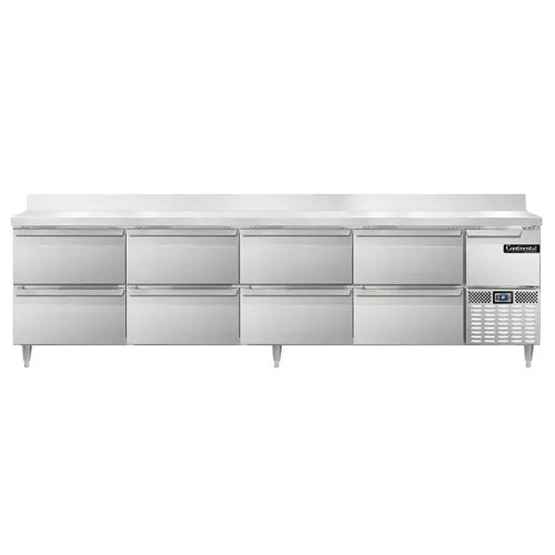 Realize kitchen dreams with the Continental Refrigerator DRA118NSSBS-D Refrigerated Counter Work Top. This designer line unit is perfect for commercial restaurant use, offering a spacious 118"W reinforced stainless steel worktop with a 5-1/2"H backsplash. The stainless steel exterior, front, sides, and interior ensure durability and easy cleaning, while the 8 drawers and 1 half-height field rehingeable door provide ample storage space for ingredients and supplies. The electronic control with a digital display allows for precise temperature management, and the hi-low alarm ensures food safety. With a 1/2 HP side-mounted refrigeration system, this unit delivers efficient cooling performance. The 6" adjustable stainless steel legs provide stability and flexibility in positioning. Made in the USA and certified by cETLus and NSF, this Continental Refrigerator worktop unit is a reliable and high-quality addition to any commercial kitchen.