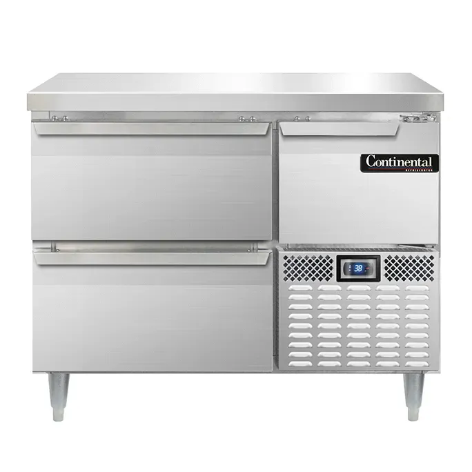 Revolutionize your cooking setup with the Continental Refrigerator DRA43NSS-D Refrigerated Counter Work Top. This designer line unit is perfect for commercial restaurant use, offering a reinforced stainless steel worktop that can withstand the demands of a busy kitchen. The stainless steel exterior, front, sides, and interior not only provide durability but also give a sleek and professional look to your establishment. With two drawers and one half-height field rehingeable door, you'll have ample storage space for your ingredients and supplies. The electronic control with a digital display allows for easy temperature adjustment and monitoring, while the hi-low alarm ensures that your perishable items are always kept at the optimal temperature. The side-mounted refrigeration system is efficient and reliable, making this unit a must-have for any commercial kitchen. Trust Continental Refrigerator, a reputable brand known for its quality and reliability. Upgrade your kitchen with the DRA43NSS-D Refrigerated Counter Work Top today.