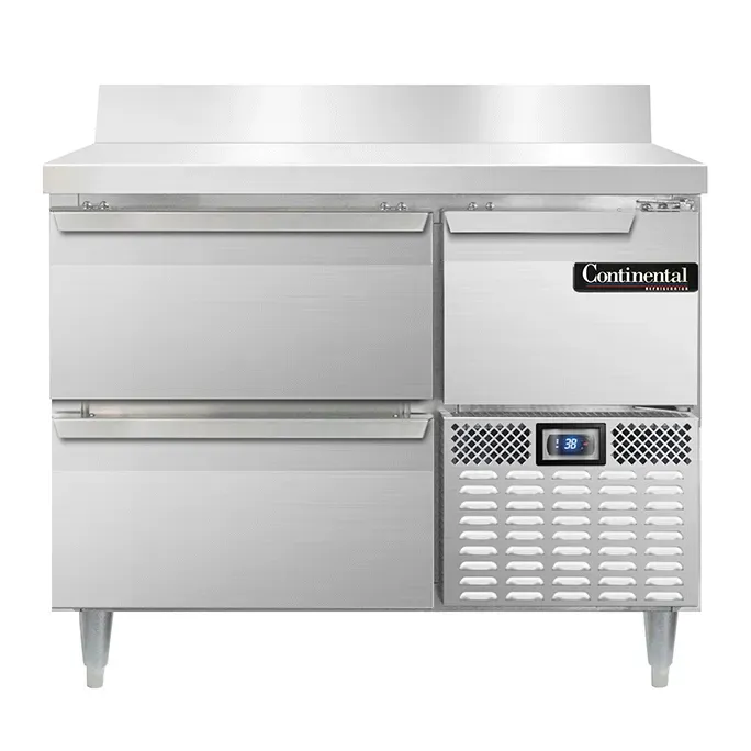 Introducing the Continental Refrigerator DRA43NSSBS-D Refrigerated Counter, Work Top - the perfect addition to drive restaurant profitability. Designed with the needs of commercial restaurants in mind, this designer line refrigerated base worktop unit offers exceptional functionality and durability. The reinforced stainless steel worktop with a 5-1/2"H backsplash provides a sturdy surface for food preparation, while the stainless steel exterior, front, sides, and interior ensure easy cleaning and long-lasting performance. With two drawers and one half-height field rehingeable door, this unit offers ample storage space for ingredients and supplies. The electronic control with a digital display allows for precise temperature management, while the hi-low alarm ensures food safety. Made in the USA and certified by cETLus and NSF, this Continental Refrigerator unit is a reliable choice for any commercial kitchen. Upgrade your restaurant's efficiency and productivity with the Continental Refrigerator DRA43NSSBS-D Refrigerated Counter, Work Top.