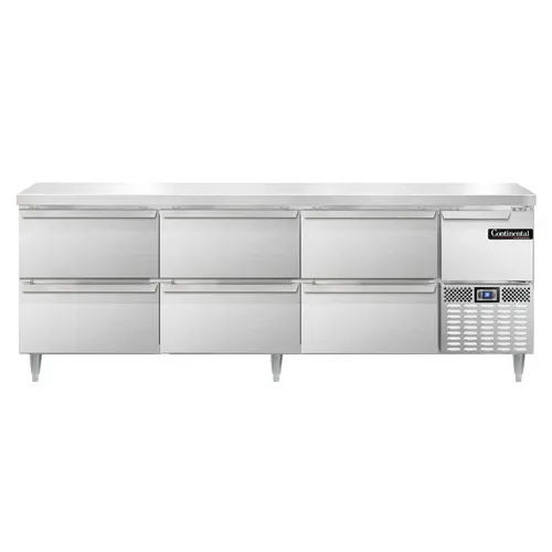 Equip your commercial kitchen with the Continental Refrigerator DRA93NSS-D Refrigerated Counter Work Top. This designer line unit is perfect for busy restaurants that require a reliable and efficient refrigeration solution. With a spacious 93" width, this worktop unit provides ample storage space for your ingredients and supplies. The reinforced stainless steel worktop is durable and easy to clean, making it ideal for food preparation tasks. The stainless steel exterior, front, sides, and interior not only give the unit a sleek and professional look but also ensure its longevity in a commercial setting. The unit features six drawers and one half-height field rehingeable door, allowing for easy access to your stored items. The electronic control with a digital display and hi-low alarm ensures precise temperature control and alerts you if there are any fluctuations. With a 1/3 HP side-mounted refrigeration system, this unit is energy-efficient and provides consistent cooling. The adjustable stainless steel legs allow for easy leveling on uneven surfaces. Made in the USA and certified by cETLus and NSF, you can trust the quality and safety of this Continental Refrigerator. Upgrade your kitchen with the Continental Refrigerator DRA93NSS-D Refrigerated Counter Work Top and experience the convenience and reliability it offers.