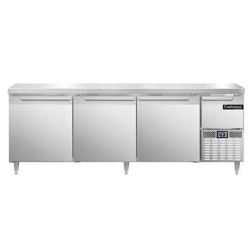 Master the art of flavor with the Continental Refrigerator DRA93NSS Refrigerated Counter Work Top. This designer line unit is perfect for commercial restaurant use, offering a spacious 93" work top made of reinforced stainless steel. The stainless steel exterior, front, sides, and interior not only provide a sleek and professional look but also ensure durability and easy cleaning. With three full-height and one half-height field rehingeable doors, you have ample storage space for all your ingredients and supplies. The electronic control with a digital display allows for precise temperature management, while the hi-low alarm ensures food safety. The side-mounted refrigeration system maximizes storage space and efficiency. Made in the USA and certified by cETLus and NSF, this Continental Refrigerator unit is a reliable and high-quality addition to any commercial kitchen.