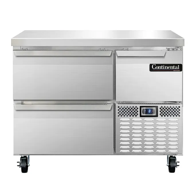 Fuel your passion for cooking with the Continental Refrigerator FA43N-D Freezer Counter Work Top. This high-quality unit is designed to meet the demands of a commercial restaurant kitchen. With its 43" wide stainless steel flat work top, it provides ample space for food preparation. The stainless steel front and end panels, along with the galvanized steel rear and grill, ensure durability and longevity. The aluminum interior is easy to clean and maintain. The unit features two drawers that can hold two 12 x 20 x 6 pans each, allowing for efficient organization and storage. Additionally, it has a half-height field rehingeable door for easy access. The electronic controller with a digital display allows for precise temperature control. With its 1/3 HP side-mounted refrigeration system, this freezer counter work top is both efficient and reliable. Made in the USA and certified by cETLus and NSF, this Continental Refrigerator unit is a must-have for any commercial kitchen.
