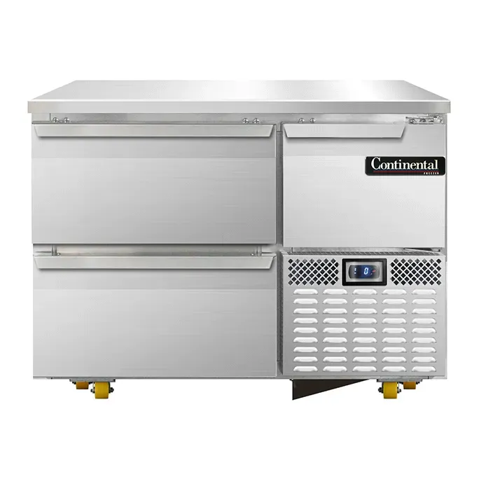 Equip your commercial kitchen with the Continental Refrigerator FA43N-U-D Freezer. This undercounter reach-in freezer is designed to meet the demands of a busy restaurant environment. With its stainless steel front and end panels, as well as a stainless steel top, this freezer is not only durable but also adds a sleek and professional look to your kitchen. The aluminum interior ensures easy cleaning and maintenance. The FA43N-U-D features two drawers and one half-height field rehingeable door, providing ample storage space for your frozen ingredients. The electronic controller with a digital display allows for precise temperature control, ensuring your food stays at the optimal temperature for freshness. The front breathing and side-mounted refrigeration system make it easy to install and maintain. With its heavy-duty support plates and 1-3/8" diameter plate casters, this freezer can be easily moved around your kitchen as needed. Trust in the quality and reliability of Continental Refrigerator, a brand known for its exceptional products.