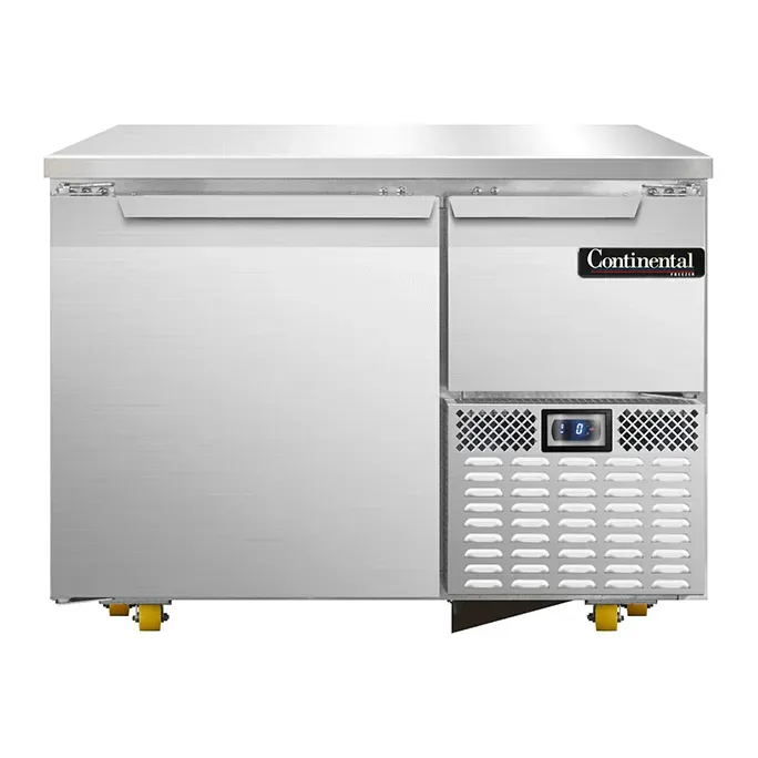 Discover the ultimate in efficient and sleek refrigeration with our Undercounter Freezer, designed to maximize your kitchen space without compromising on performance. This 43-inch wide, shallow depth base unit features a robust stainless steel front and end panels paired with a durable stainless steel top, ensuring both style and longevity. Inside, the aluminum interior enhances cooling efficiency, while the versatile design includes one full and one half-height field rehingeable doors, providing the flexibility you need for dynamic kitchen environments. The electronic control system ensures precise temperature management, complemented by an off-cycle defrost feature for optimal operation. Equipped with eight 1-3/8" diameter plate casters mounted on heavy-duty support plates, this unit promises easy mobility and installation. Powered by a reliable 1/3 HP motor and utilizing eco-friendly R290 hydrocarbon refrigerant, the front-breathing, side-mounted refrigeration system ensures consistent performance. Certified by cETLus and NSF, you can trust in its quality and safety standards. Perfect for professional kitchens that demand efficiency and reliability, this reach-in freezer seamlessly integrates into your workspace, providing unparalleled convenience and functionality.