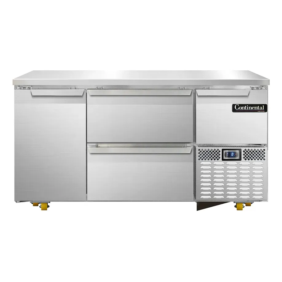 Elevate your cuisine with the Continental Refrigerator FA60N-U-D Freezer. This undercounter reach-in freezer is designed to meet the demands of a commercial restaurant setting. With its stainless steel front and end panels, as well as a stainless steel top, this freezer not only looks sleek but is also durable and easy to clean. The aluminum interior ensures optimal temperature retention, while the electronic controller with a digital display allows for precise temperature control. The FA60N-U-D features two drawers and one full-height and one half-height field rehingeable door, providing ample storage space for your ingredients. Additionally, the front breathing and side-mounted refrigeration system ensure efficient cooling without taking up valuable kitchen space. With its heavy-duty support plates and 1-3/8" diameter plate casters, this freezer is easy to move and install. Trust in the Continental Refrigerator FA60N-U-D to keep your ingredients fresh and your kitchen running smoothly.