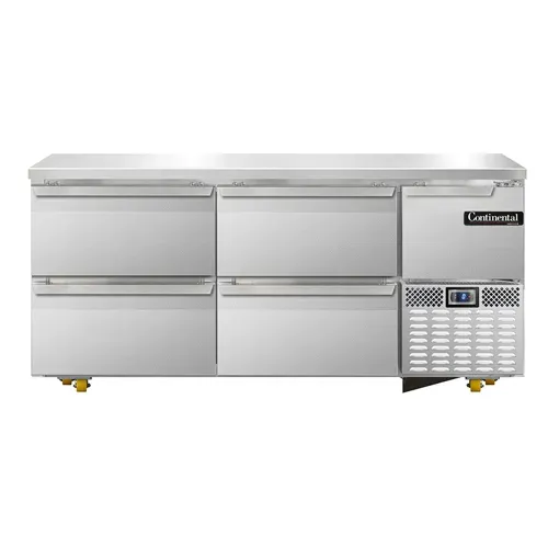 Deliver food perfection with the Continental Refrigerator FA68N-U-D Freezer. This undercounter reach-in freezer is designed to meet the demands of a commercial restaurant, ensuring that your ingredients stay fresh and your dishes are served at their best. With its stainless steel front and end panels, as well as a stainless steel top, this freezer not only looks sleek but also provides durability and easy cleaning. The aluminum interior and four drawers, along with a half-height field rehingeable door, offer ample storage space and easy access to your frozen goods. The electronic controller with a digital display allows for precise temperature control, while the front breathing and side-mounted refrigeration ensure efficient cooling. Made in the USA and certified by cETLus and NSF, this Continental Refrigerator FA68N-U-D Freezer is a reliable and high-quality addition to any commercial kitchen.
