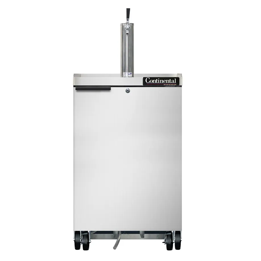 Revolutionize your cooking setup with the Continental Refrigerator KC24NSS Draft Beer Cooler. This top-of-the-line keg cooler is designed to meet the demands of a busy commercial restaurant. With a capacity of 8.0 cu. ft., it can accommodate one barrel or straight wall keg, ensuring you always have a refreshing draft beer on tap for your customers. The stainless steel top features a column and drainer, providing a sleek and functional workspace. The door is equipped with a lock for added security. The electronic controller with a digital display and hi-low alarm allows you to easily monitor and adjust the temperature. The stainless steel exterior and galvanized interior with a reinforced stainless steel floor ensure durability and easy cleaning. With rear-mounted self-contained refrigeration and 5" casters, this keg cooler is both efficient and mobile. Made in the USA and certified by cETLus and NSF, you can trust the quality and reliability of Continental Refrigerator. Upgrade your restaurant's beverage service with the Continental Refrigerator KC24NSS Draft Beer Cooler.