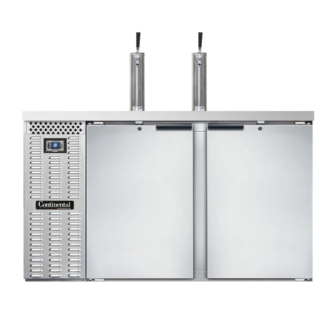 Master the art of cooking with the Continental Refrigerator KC59SNSS Draft Beer Cooler. This top-of-the-line keg cooler is designed to meet the needs of commercial restaurants, offering a spacious 15.0 cu. ft. capacity that can accommodate two barrels or two straight wall kegs. The front breathing design ensures efficient operation, while the stainless steel top, columns, and drainer provide durability and a sleek appearance. With its shallow depth of 23", this cooler is perfect for establishments with limited space. The two doors feature locks for added security, and the electronic controller with a digital display and hi-low alarm allows for precise temperature control. Made in the USA, this self-contained refrigeration unit boasts a 1/3 HP compressor for reliable performance. Trust Continental Refrigerator to deliver a high-quality draft beer cooler that will enhance your restaurant's beverage service.