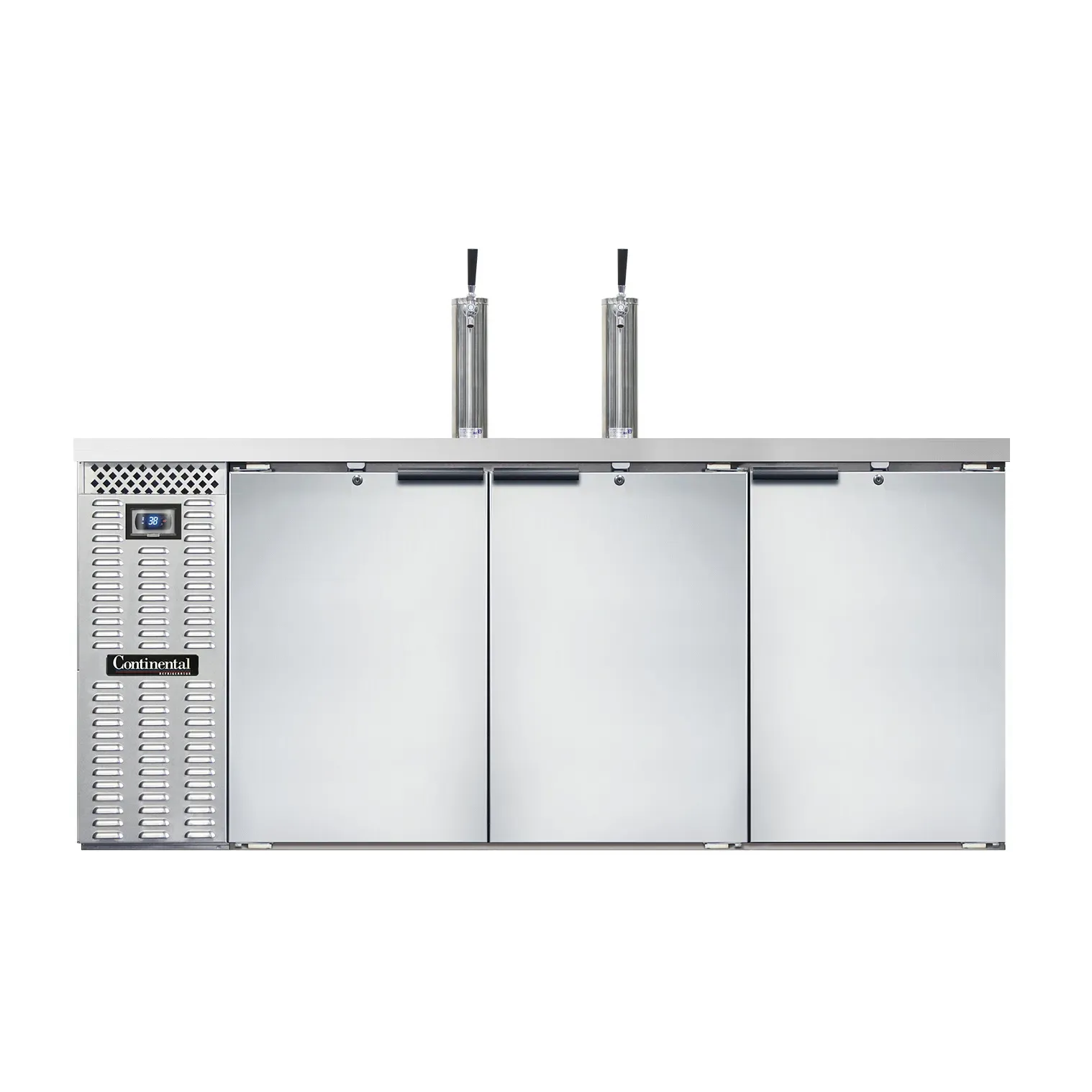 Mobilize your kitchen with the Continental Refrigerator KC79SNSS Draft Beer Cooler. This top-of-the-line keg cooler is designed to meet the demands of a busy commercial restaurant. With a spacious 28.0 cu. ft. capacity, it can hold up to three barrels or straight wall kegs, ensuring you always have a variety of draft beers on tap for your customers to enjoy. The stainless steel top features two columns and a drainer, providing a sleek and functional workspace. The electronic controller with a digital display and hi-low alarm allows for precise temperature control and ensures your beer is always served at the perfect temperature. The stainless steel exterior and galvanized interior with a reinforced stainless steel floor make this cooler durable and easy to clean. Made in the USA and certified by cETLus and NSF, you can trust the quality and reliability of Continental Refrigerator. Upgrade your restaurant's beverage service with the Continental Refrigerator KC79SNSS Draft Beer Cooler.