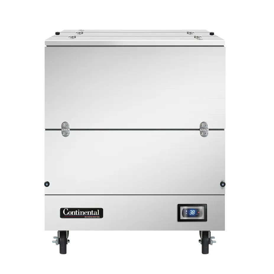 Equip your commercial kitchen with the Continental Refrigerator MC3NSSDCW Milk Cooler / Station. This stainless steel milk cooler is designed to meet the demands of a busy restaurant environment. With a 34" length and dual access, it offers ample space for storing up to (8) 13" x 13" x 11" crates or (4) 19" x 13" x 11" crates. The cold wall cooling system ensures that your milk stays at the perfect temperature, while the electronic control with digital display allows for easy monitoring and adjustment. The door cylinder security locks provide added protection, and the hi-low alarm and hi/low temperature alarm ensure that you are always aware of any fluctuations. With a 1/4 HP motor and four 5" swivel casters, this milk cooler is both powerful and portable. Trust Continental Refrigerator for quality and reliability in your commercial kitchen.