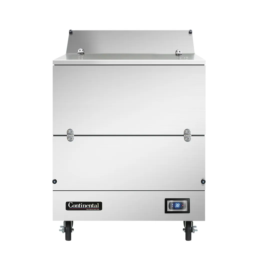 Enhance the heart of your restaurant with the Continental Refrigerator MC3NSSS Milk Cooler / Station. This stainless steel milk cooler is designed to meet the demands of a busy commercial restaurant. With a length of 34 inches, it provides ample space for storing milk crates, with a capacity of either eight 13" x 13" x 11" crates or four 19" x 13" x 11" crates. The forced air cooling system ensures that your milk stays at the perfect temperature, while the electronic control with digital display allows for easy monitoring and adjustment. The door cylinder security lock provides added protection, and the hi-low alarm and hi/low temperature alarm ensure that you are always aware of any fluctuations. With a 1/4 HP motor and four 5" swivel casters, this milk cooler is both powerful and portable. Made in the USA and certified by cETLus and NSF, you can trust the quality and reliability of Continental Refrigerator. Upgrade your restaurant's milk storage with the MC3NSSS Milk Cooler / Station.