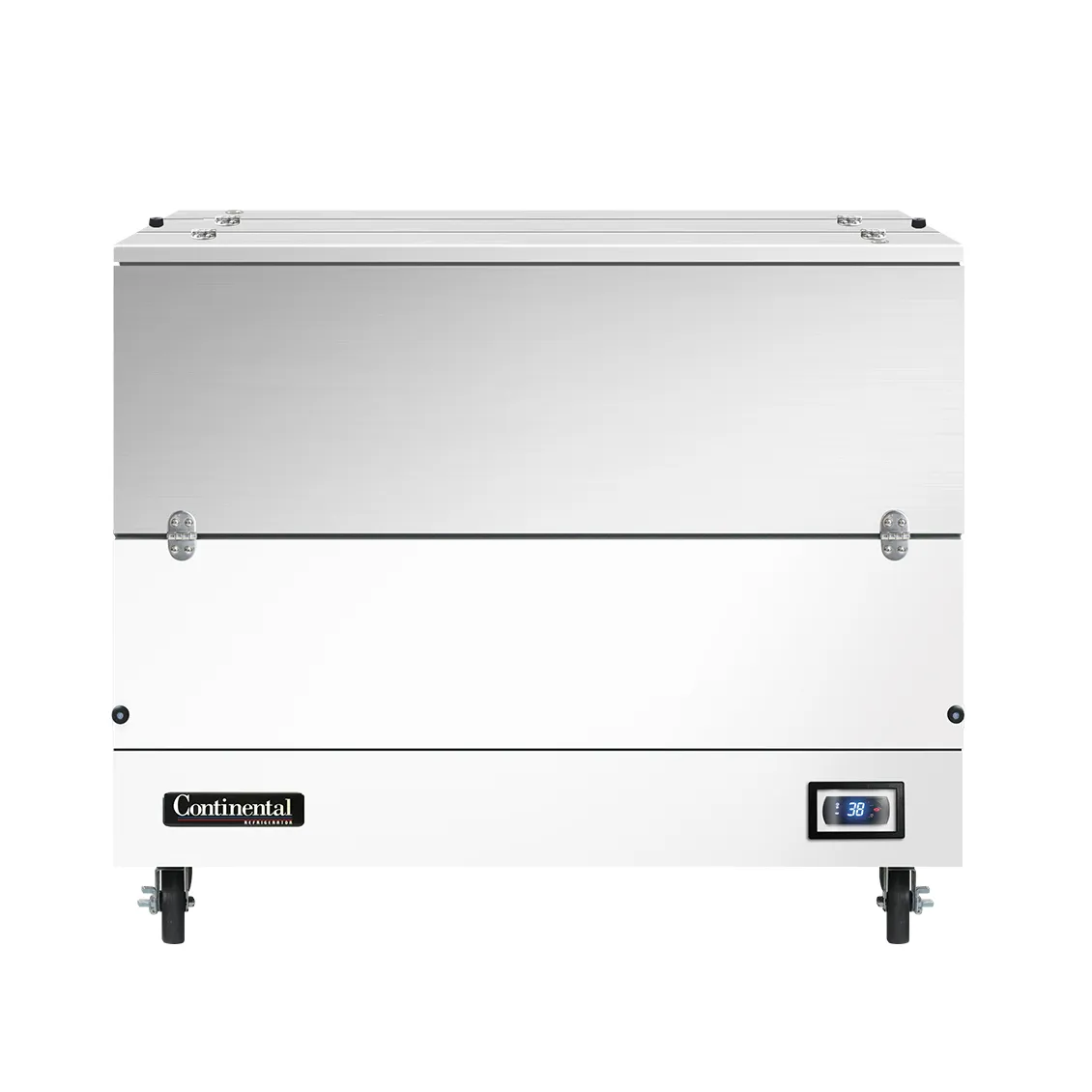 Maximize your food service potential with the Continental Refrigerator MC4NDCW Milk Cooler / Station. This top-of-the-line milk cooler is designed to meet the demands of a busy commercial restaurant. With its dual access feature, you can easily store and retrieve up to (12) 13" x 13" x 11" crates or (8) 19" x 13" x 11" crates, providing ample space for your milk storage needs. The cold wall cooling system ensures that your milk stays at the perfect temperature, while the electronic control with digital display allows for precise temperature management. The hi-low alarm and hi/low temperature alarm provide added peace of mind, alerting you to any fluctuations in temperature. Made in the USA, this milk cooler features a durable stainless steel top, lids, and doors, as well as door cylinder security locks for added security. The white finished steel exterior body not only looks sleek but is also easy to clean. The galvanized interior with a reinforced stainless steel floor and floor drain ensures easy maintenance. Equipped with (4) 5" swivel casters with front locking brakes, this milk cooler is easy to maneuver and secure in place. Trust Continental Refrigerator to deliver a high-quality milk cooler that will enhance your restaurant's efficiency and productivity.
