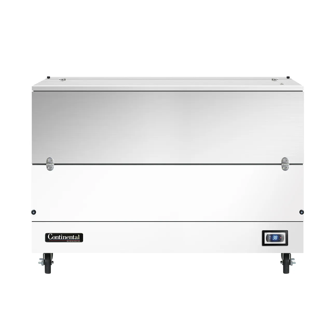 Revolutionize your cooking setup with the Continental Refrigerator MC5NSCW Milk Cooler / Station. This top-of-the-line milk cooler is designed to meet the demands of a busy commercial restaurant. With its 58" length and single access, it provides ample space for storing up to (16) 13" x 13" x 11" crates or (10) 19" x 13" x 11" crates of milk. The cold wall cooling system ensures that your milk stays at the perfect temperature, while the electronic control with digital display allows for easy monitoring and adjustment. The hi-low alarm and hi/low temperature alarm provide added peace of mind. Made in the USA, this milk cooler features a stainless steel top, lid, and door for durability and easy cleaning. The door cylinder security lock ensures that your milk is safe and secure. With its white finished steel exterior body and galvanized interior with reinforced stainless steel floor, this milk cooler is built to withstand the rigors of a commercial kitchen. The floor drain and swivel casters with front locking brakes make cleaning and maneuverability a breeze. Trust Continental Refrigerator to deliver the quality and reliability you need for your restaurant.