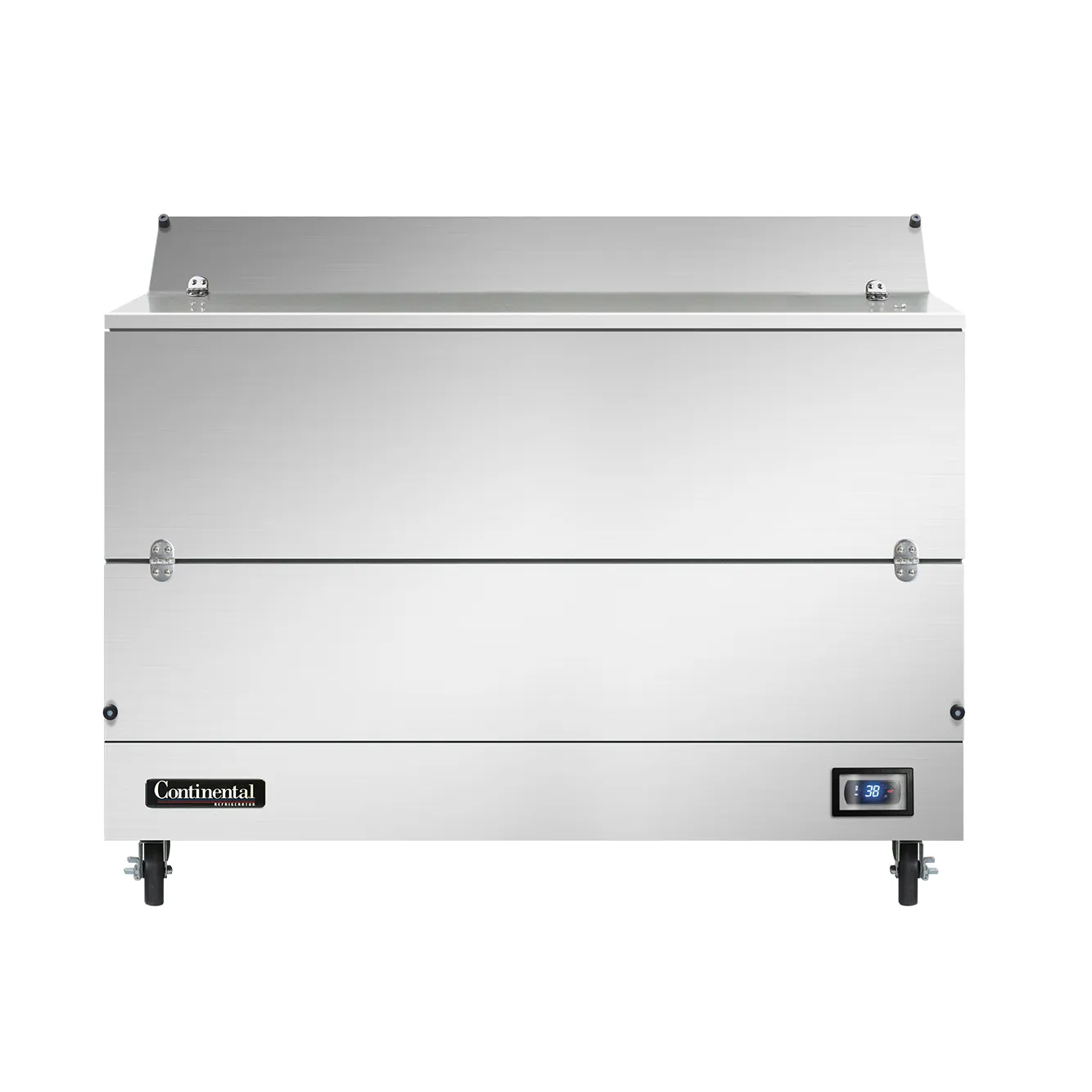 Unleash gastronomic brilliance with the Continental Refrigerator MC5NSSS Milk Cooler / Station. This top-of-the-line milk cooler is a must-have for any commercial restaurant looking to elevate their beverage service. With its stainless steel interior and exterior, this cooler not only exudes durability and style but also ensures easy cleaning and maintenance. The forced air cooling system guarantees that your milk stays at the perfect temperature, while the electronic control with a digital display allows for precise temperature management. The hi-low alarm and hi/low temperature alarm provide added peace of mind, alerting you to any fluctuations in temperature. With a capacity of (16) 13" x 13" x 11" or (10) 19" x 13" x 11" crates, this cooler can accommodate a large quantity of milk, ensuring that you never run out during peak hours. The door cylinder security lock adds an extra layer of protection, keeping your milk safe and secure. Equipped with a floor drain and 5" swivel casters with front locking brakes, this milk cooler is not only convenient but also easy to move around your restaurant. Trust in the Continental Refrigerator MC5NSSS Milk Cooler / Station to enhance your beverage service and keep your milk fresh and delicious.