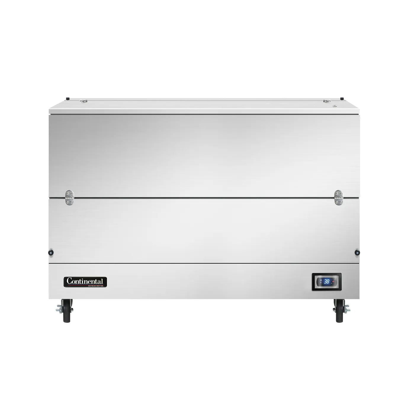 Introducing the Continental Refrigerator MC5NSSSCW Milk Cooler / Station, designed to simplify restaurant operations. This top-of-the-line milk cooler is a must-have for any commercial restaurant looking to streamline their beverage service. With its spacious 58" long design, this cooler can accommodate either (16) 13" x 13" x 11" crates or (10) 19" x 13" x 11" crates, providing ample storage space for your milk supply. The cold wall cooling system ensures that your milk stays at the perfect temperature, while the electronic control with digital display allows for easy monitoring and adjustment. The hi-low alarm and hi/low temperature alarm provide added peace of mind, alerting you to any fluctuations in temperature. Made in the USA with a stainless steel interior and exterior, this milk cooler is not only durable but also easy to clean. The door cylinder security lock ensures that your milk supply remains secure at all times. Equipped with a floor drain and (4) 5" swivel casters with front locking brakes, this milk cooler is both convenient and mobile. Simplify your restaurant operations with the Continental Refrigerator MC5NSSSCW Milk Cooler / Station.