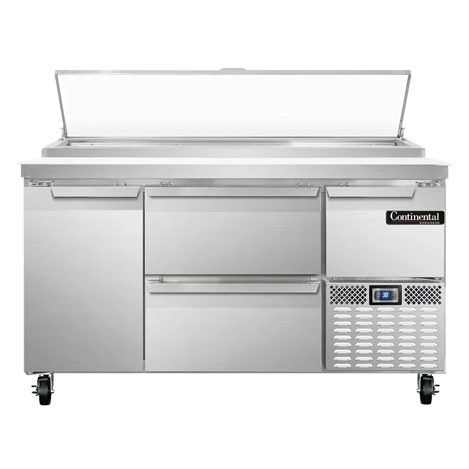 Maximize your food service potential with the Continental Refrigerator PA60N-D Refrigerated Counter, Pizza Prep Table. This two-section table is designed to meet the demands of a busy commercial restaurant. With a 19.0 cu ft capacity, it offers ample space for storing and preparing ingredients. The 300 series stainless steel work top provides a durable and hygienic surface for food preparation, while the 19" deep nylon cutting board allows for convenient slicing and dicing. The table features two drawers that can hold two 12 x 20 x 6 pans each, allowing for easy organization of ingredients. The full and half height field rehingeable doors provide flexibility and accessibility. The electric condensate evaporator ensures efficient operation, while the side-mounted refrigeration system maximizes storage space. With its electronic controller and digital display, you can easily monitor and adjust the temperature. Made in the USA and certified by cETLus and NSF, this pizza prep table is a reliable and high-quality addition to any commercial kitchen.