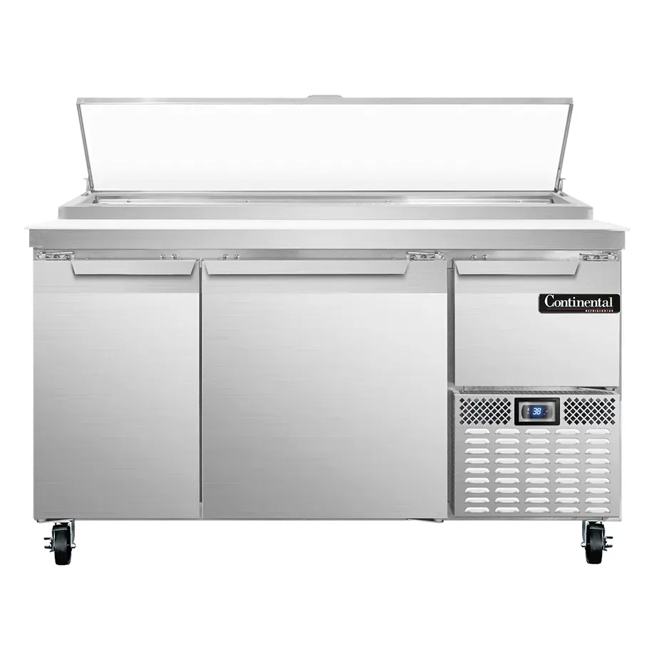 Cook with precision using the Continental Refrigerator PA60N Refrigerated Counter Pizza Prep Table. This two-section table is designed to meet the needs of busy commercial restaurants. With a 19.0 cu ft capacity, it offers ample space for storing ingredients and preparing pizzas. The 300 series stainless steel worktop provides durability and a hygienic surface, while the 19" poly cutting board allows for convenient food preparation. The table features two full and one half-height field rehingeable doors, allowing for easy access to stored items. The electric condensate evaporator ensures efficient operation, while the side-mounted refrigeration system keeps ingredients at the perfect temperature. The electronic controller with a digital display allows for precise temperature control. Made in the USA and certified by cETLus and NSF, this pizza prep table is a reliable and high-quality addition to any commercial kitchen.