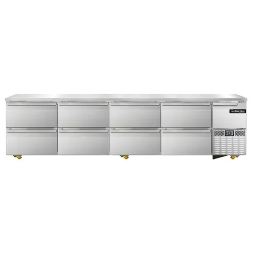 Deliver food perfection with the Continental Refrigerator RA118N-U-D Undercounter Refrigerated Base. This top-of-the-line refrigerator is designed to meet the demanding needs of commercial restaurants. With its stainless steel front and end panels, as well as a stainless steel top, this unit not only looks sleek but is also built to withstand the rigors of a busy kitchen. The aluminum interior ensures optimal temperature retention, while the electronic controller with a digital display allows for precise temperature control. The RA118N-U-D features eight drawers and one half-height field rehingeable door, providing ample storage space for all your ingredients. Additionally, the front breathing, side-mounted refrigeration system ensures efficient cooling without taking up valuable kitchen space. With its heavy-duty support plates and 12 plate casters, this refrigerator is easy to move and install. Trust Continental Refrigerator for a reliable and durable refrigeration solution that will enhance the efficiency of your commercial kitchen.