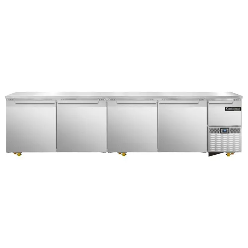 Ignite culinary passion with the Continental Refrigerator RA118N-U Undercounter Reach-In Refrigerator. This top-of-the-line refrigerator is designed to meet the demanding needs of commercial restaurants. With its stainless steel front and end panels, as well as a stainless steel top, this unit not only looks sleek but is also built to withstand the rigors of a busy kitchen. The aluminum interior provides excellent insulation and durability. The RA118N-U features four full-height and one half-height field rehingeable doors, allowing for easy access to your ingredients. The electronic controller with a digital display ensures precise temperature control, while the front breathing, side-mounted refrigeration system maximizes space efficiency. With 12 plate casters mounted on heavy-duty support plates, this refrigerator is easily movable for cleaning and maintenance. NSF and cETLus certified, this Made in USA refrigerator is a reliable and efficient addition to any commercial kitchen.