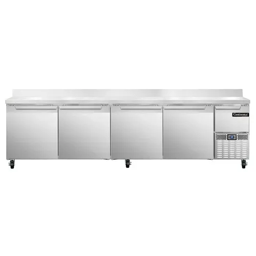 Elevate your dining experience with the Continental Refrigerator RA118NBS Refrigerated Counter Work Top. This top-of-the-line unit is designed to meet the demanding needs of commercial restaurants. With its 118" width, it provides ample space for food preparation, making it perfect for high-volume establishments. The 300 series stainless steel work top with a 5-1/2" backsplash ensures durability and easy cleaning, while the stainless steel front and end panels add a sleek and professional look to your kitchen. The galvanized steel rear and grill, along with the aluminum interior, further enhance the unit's longevity. The RA118NBS features four full and one half-height field rehingeable doors, allowing for easy access to stored items. The electronic controller with a digital display ensures precise temperature control, while the side-mounted refrigeration system maximizes storage space. This NSF-certified unit is proudly made in the USA and is a reliable addition to any commercial kitchen.