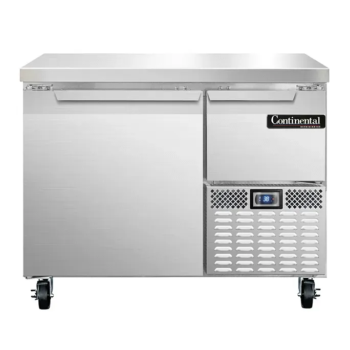 Introducing the Continental Refrigerator RA43N, a must-have for any commercial restaurant looking to craft culinary wonders. This refrigerated counter worktop unit is designed to enhance efficiency and productivity in the kitchen. With its 43" wide 300 series stainless steel flat worktop, it provides ample space for food preparation. The stainless steel front and end panels, along with the galvanized steel rear and grill, ensure durability and longevity. The aluminum interior is easy to clean and maintain, making it perfect for busy restaurant environments. The unit features one full and one half-height field rehingeable doors, allowing for easy access to stored items. The electronic controller with a digital display ensures precise temperature control, while the side-mounted refrigeration system maximizes storage space. Made in the USA and certified by cETLus and NSF, the Continental Refrigerator RA43N is a reliable and efficient addition to any commercial kitchen.