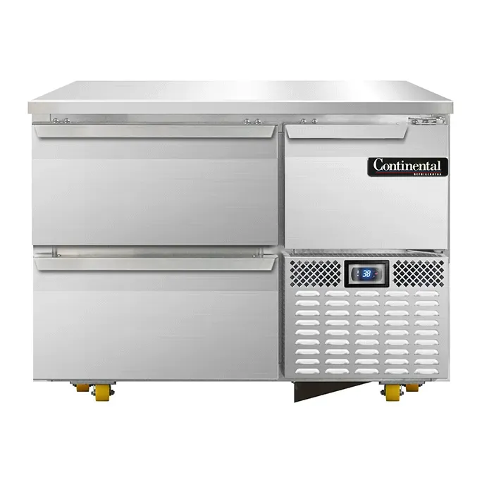 Ignite culinary passion with the Continental Refrigerator RA43N-U-D Undercounter Refrigerated Base. This top-of-the-line refrigerator is designed to meet the demanding needs of commercial restaurants. With its stainless steel front and end panels, as well as a stainless steel top, this unit not only looks sleek but is also built to withstand the rigors of a busy kitchen. The aluminum interior ensures optimal temperature retention, while the electronic controller with a digital display allows for precise temperature adjustments. The RA43N-U-D features two drawers and one half-height field rehingeable door, providing ample storage space for ingredients and perishables. The front breathing, side-mounted refrigeration system ensures efficient cooling, while the eight heavy-duty casters make it easy to move and install. NSF and cETLus certified, this refrigerator is made in the USA and is a reliable addition to any commercial kitchen.