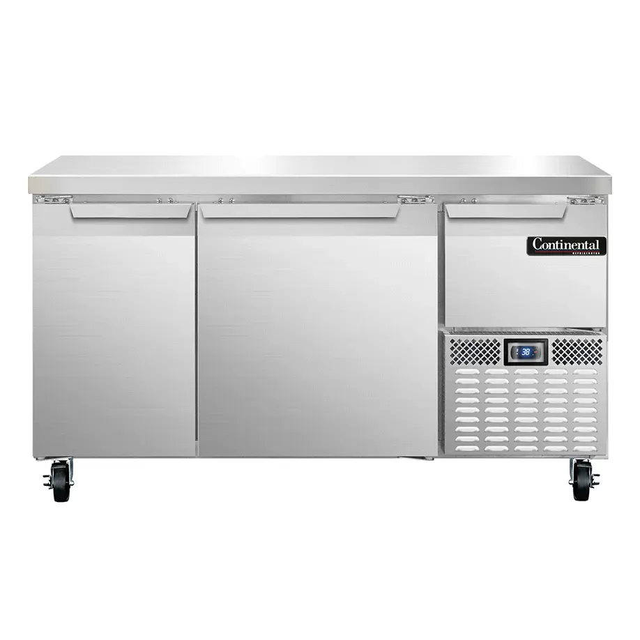Unleash your kitchen's potential with the Continental Refrigerator RA60N Refrigerated Counter Work Top. This top-of-the-line unit is designed to meet the demands of a busy commercial restaurant. With its 60" wide refrigerated base worktop, it provides ample space for food preparation while keeping ingredients fresh and easily accessible. The 300 series stainless steel flat worktop, stainless steel front and end panels, and galvanized steel rear and grill ensure durability and longevity, even in a high-volume kitchen. The aluminum interior and field rehingeable doors make cleaning and maintenance a breeze. Equipped with an electronic controller with a digital display, you can easily monitor and adjust the temperature to keep your ingredients at their optimal freshness. The side-mounted refrigeration and 1/3 HP compressor ensure efficient cooling and energy savings. NSF and cETLus certified, this Made in USA unit is a reliable and essential addition to any commercial kitchen.