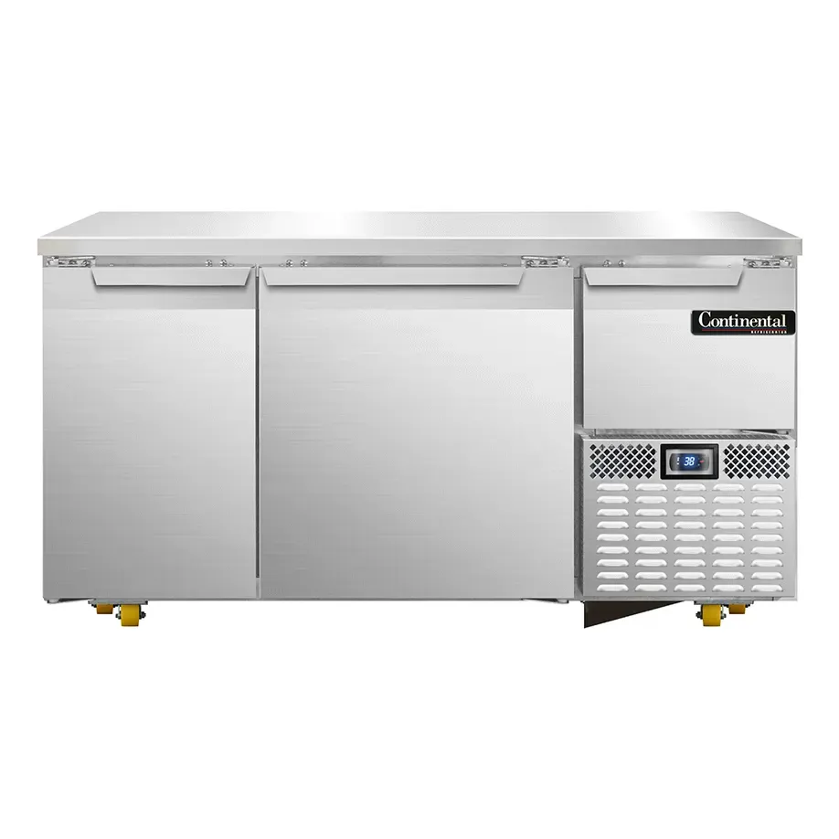Optimize your kitchen efficiency with the Continental Refrigerator RA60N-U Undercounter Reach-In Refrigerator. This high-quality refrigerator is designed to meet the demands of a commercial restaurant setting. With its stainless steel front and end panels, as well as a stainless steel top, this unit is not only durable but also easy to clean. The aluminum interior provides excellent insulation and helps maintain the ideal temperature for your ingredients. The RA60N-U features two full-height and one half-height field rehingeable doors, allowing for easy access to your stored items. The electronic controller with a digital display ensures precise temperature control, while the front breathing, side-mounted refrigeration system maximizes space in your kitchen. Additionally, the refrigerator comes with eight heavy-duty casters, making it easy to move and install. Trust Continental Refrigerator for a reliable and efficient refrigeration solution for your commercial kitchen.