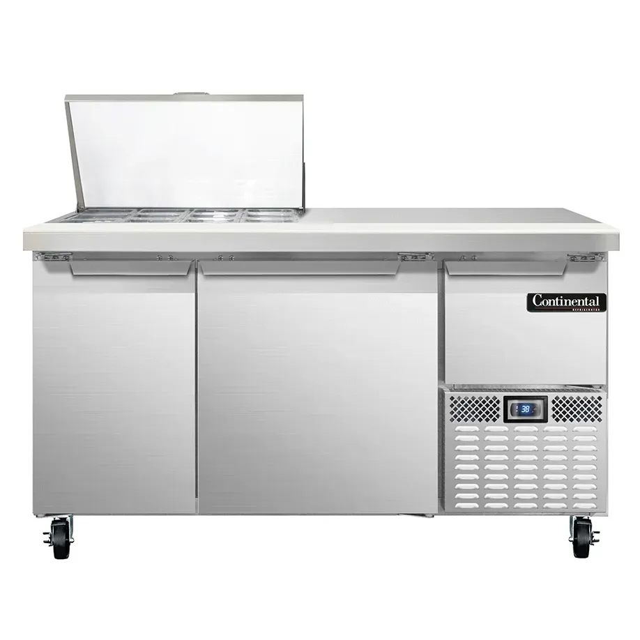 Introducing the Continental Refrigerator RA60N12M, a refrigerated counter that will simplify restaurant operations. This mega top sandwich/salad unit is designed to meet the demands of a busy commercial kitchen. With its 60" wide, 300 series stainless steel top, it provides ample space for food preparation. The unit comes with 12 non-recessed pans, each 1/6 size and 4" deep, allowing for easy organization and access to ingredients. The stainless steel front and sides, along with the galvanized steel case back, ensure durability and longevity. Inside, the aluminum interior is easy to clean and maintain. The unit features a 10" deep nylon cutting board, perfect for slicing and dicing. With two full-height and one half-height field rehingeable doors, accessing stored items is a breeze. The electronic controller with digital display allows for precise temperature control. Powered by a 1/3 HP side-mounted refrigeration system, this unit is both efficient and reliable. NSF and cETLus certified, this refrigerated counter is made in the USA, guaranteeing its authenticity and quality. Upgrade your restaurant's efficiency with the Continental Refrigerator RA60N12M.