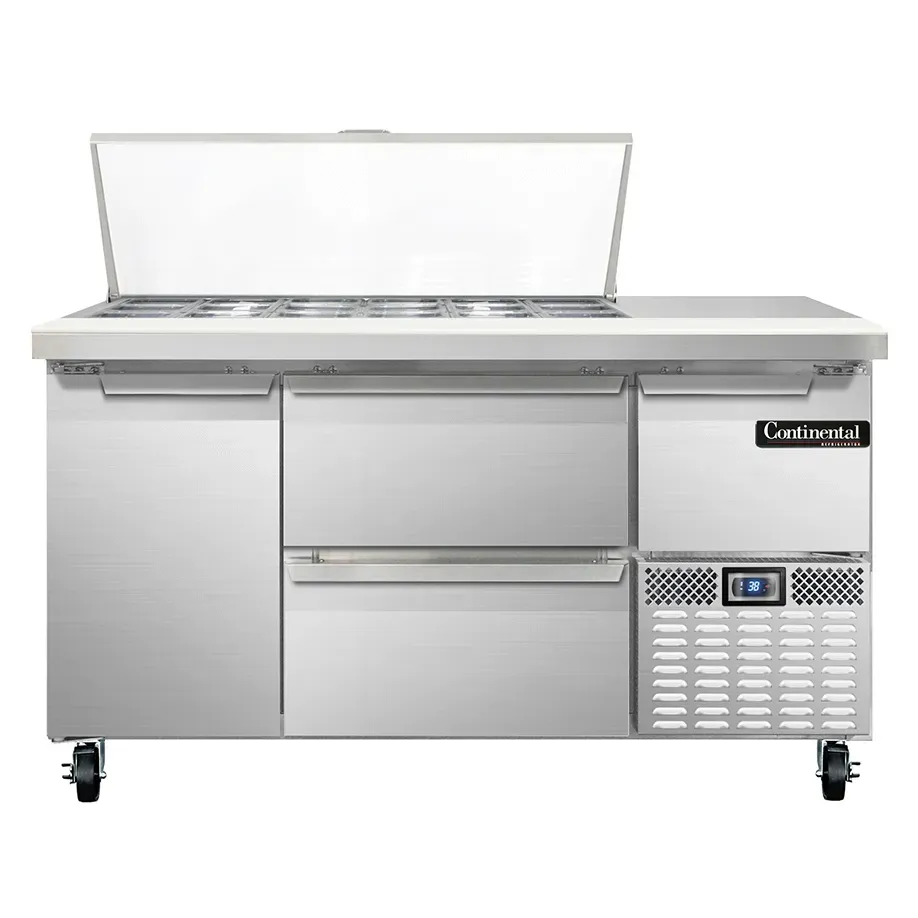 Unleash culinary creativity with the Continental Refrigerator RA60N18M-D Refrigerated Counter, Mega Top Sandwich / Salad Unit. This top-of-the-line unit is designed to meet the demands of a busy commercial restaurant kitchen. The 300 series stainless steel (Mighty) top features 18 non-recessed pans, allowing for easy access to ingredients while keeping them fresh and cool. The stainless steel front and sides, along with the galvanized steel case back, ensure durability and longevity. Inside, the aluminum interior provides a hygienic and easy-to-clean surface. The unit also includes a 10" deep nylon cutting board for convenient food preparation. With two drawers and two doors, this unit offers ample storage space for ingredients and supplies. The electronic controller with digital display allows for precise temperature control, ensuring that your ingredients stay at the perfect temperature. With its reliable performance, spacious design, and high-quality construction, the Continental Refrigerator RA60N18M-D is the ideal choice for any commercial restaurant looking to elevate their sandwich and salad preparation.
